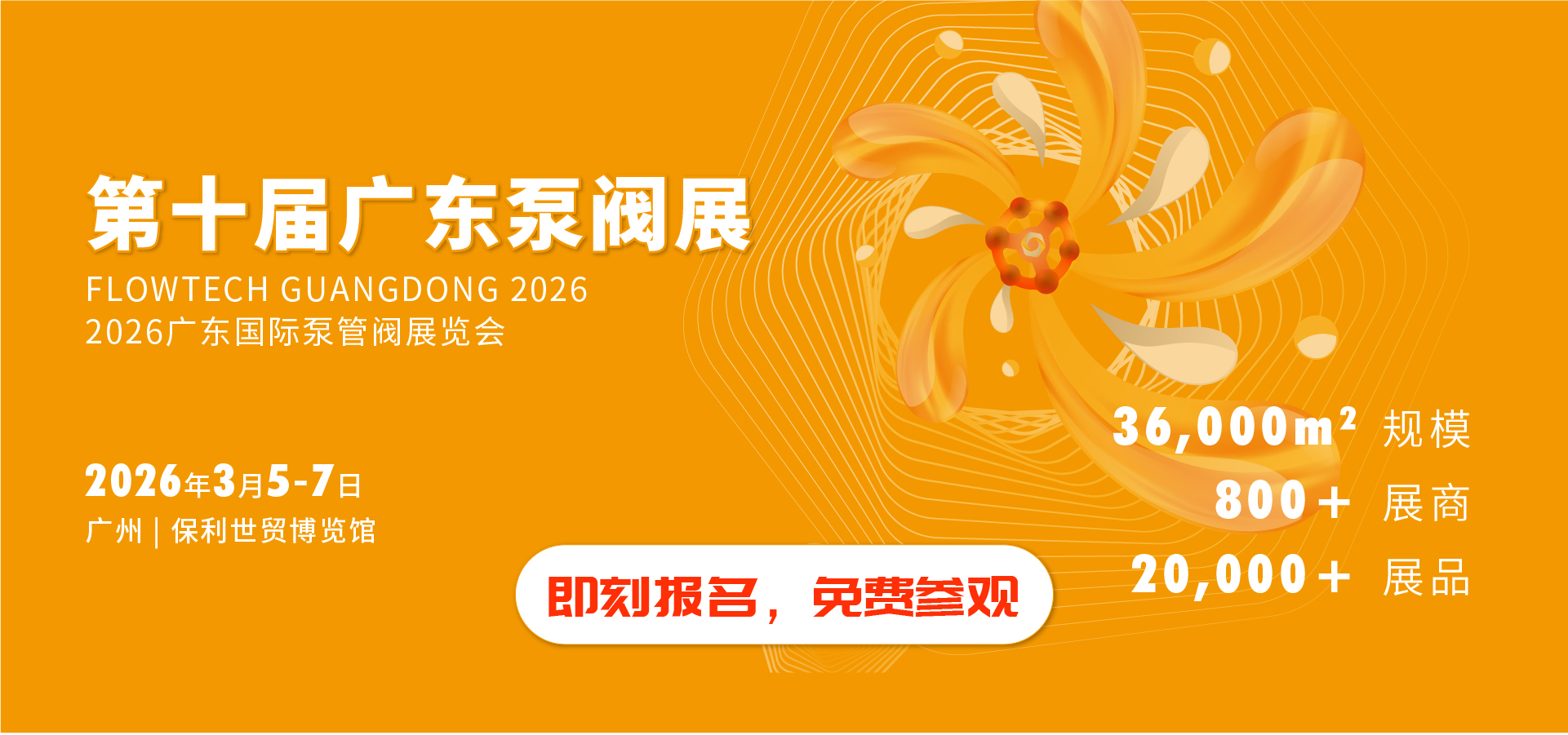 第十屆廣東泵閥展將于2026年3月5-7日在廣州丨保利世貿博覽館盛大啟幕!展覽面積達36,000平方米,預計將匯聚超20,000名專業觀眾,吸引800余家優質展商踴躍參展。